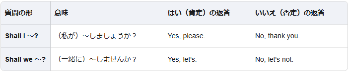 - Shall I/we 〜?への返答: “Shall I 〜?”(私が〜しましょうか?)や”Shall we 〜?”(一緒に〜しましょうか?)のような提案の疑問文に対しては,特別な決まり文句があります。詳しくは下段に書いてます。