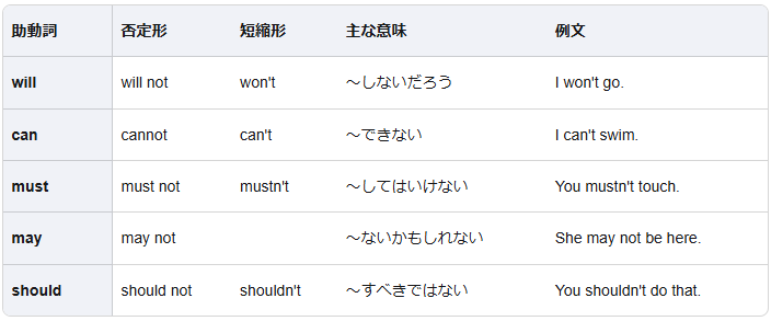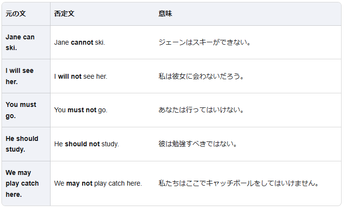 助動詞を使った文を否定形にするには、助動詞の直後に「not」を加えるだけです。