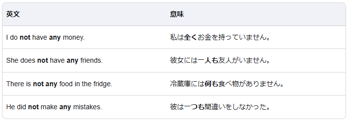 例: I don’t have any money.(私はお金がない)