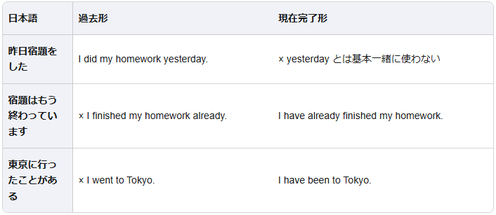 - 時間の明示:過去形は具体的な過去の時点を示す語句とセットで使うことが多い。現在完了形は「いつ起こったか」よりも「現在にどう影響しているか」が重要